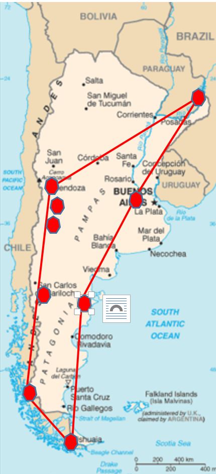 | Day 27 26/12oC | About 3 hours drive south of Puerto Madryn is Punta Tombo, an area famous for its vast colony of Magellanic penguins. Recommended to use the day to visit here. May be better to join a tour for Punta Tomba £85 each – less stress than driving on slow gravel roads | Hotel Territorio Puerto Madryn (Trelew) |