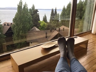 I took over the driving as was feeling decidedly car sick. The car is a basic Nissan March with no central locking. We arrived at our destination at around 2pm, Design Suites Bariloche. After a cup of coffee our room was ready. Scored again, a magnificent room with a panoramic view of the lake and mountains. A jacuzzi bath situated in the bedroom directly overlooking the lake, hmm a tad bit different! May report further on that in due course. A separate shower room en suite.